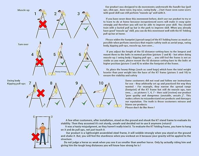 - Safe For All Your Family Members: Unlike some other Pull Up Dip Stations with narrow footprint, KT Freestanding Pull Up Bar is much more widely so your shin or knee will never hit on the frame as you drop back down from pull ups. You will never feel cramped in it even if youβre a big person. The handle bar width is 39.37ββ, allows you to hold wide or narrow as your fitness purpose. Its handle bar also NEVER falls down suddenly like some kinds of doorway pull up bars
