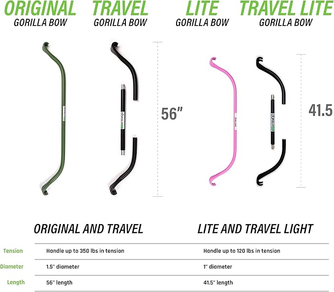 - Whatβs Included - Original Bow, Green, Heavy Bundle includes a full-length 56β Bow; (8) Double-Wall Gorilla Bands ((2) 60 lb., (3) 50 lb., (1) 30 lb., (1) 20 lb., (1) 10 lb.); Band Wrap; 30 Days of Gorilla Bow All-Access Membership