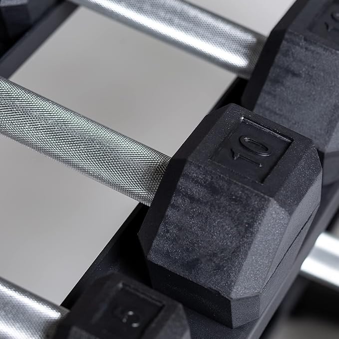 - Rubber Hex Dumbbells ??Safe & Quiet: Durable rubber coating reduces noise and floor damage while the hexagonal heads prevent rolling. Ergonomic, knurled handles ensure a secure, comfortable grip.