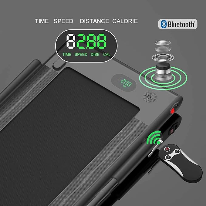 - WITH APP CONTROL, BLUETOOTH SPEAKER, PHONE HOLDER & REMOTE CONTROL β APP control is perfect to record exercise data. Connect the treadmill to your phone through Bluetooth, so you can play music while you are exercising. You can also use the phone holder to watch videos or chat with friends. The remote control (BATTERY NOT INCLUDED) is convenient to adjust the speed of movement and stop instantly. Equipped with a safety key to shut down immediately in an emergency to protect your safety.