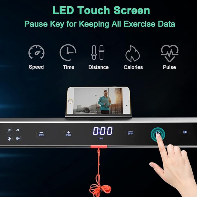 - š¦š¶šŗš½š¹š² š¢š½š²šæš®šš¶š¼š»: This under desk treadmill features LED touch screen, offering real-time feedback of calories, pulse, time, distance and speed. The treadmill could also be control and adjust via App and remote. Furthermore, all sports data will be kept when you press the pause key for water break and you can switch speed unit between mile and km in APP.