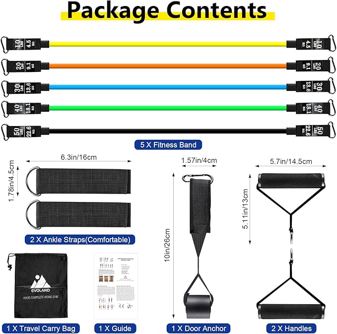 - 【Different Color】:Yellow (10 lbs), Red (20 lbs), Blue (30 lbs), Green (40 lbs), Black(50 lbs). All exercise bands can be used alone or stacked in any combination to a maximum equivalent of 150 lbs.