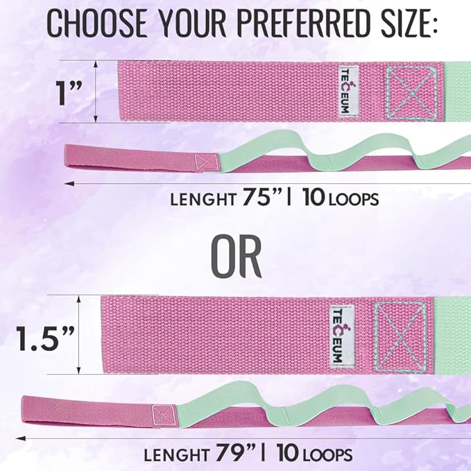 - STRETCHING STRAP. Color: LAVENDER GREEN. Material: POLYPROPYLENE. Width: 1.5 IN. Length: 79 IN. 10 Loops. Non-elastic. Superior Non-slip Grip.
