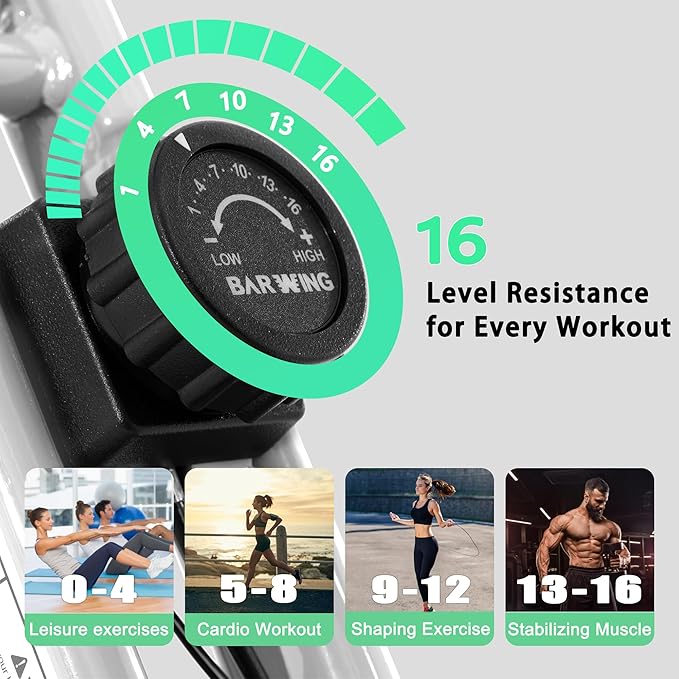 - 【SUPER QUIET】The upgraded magnetic resistance keeps the exercise bike very quiet (<20dB) while riding, it also provides 16 levels of gear adjustment for you to ride freely. Heavy-duty steel frame combined with X-type design physical balance theory, provide you a stable exercise bike, support limited to 350 LB Capacity.