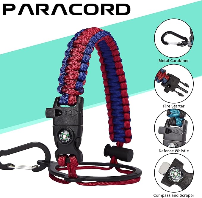 - UNIQUE DESIGNS PARACORD HANDLE: Full-function paracord handle made in individual styles to match the color of the flask water bottles. With compass, safety ring, carabiner, flint fire starter & whistle. It unravels into a sturdy and taut rope in an emergency, making the large water jug an ideal survival kit for expeditions in the wild