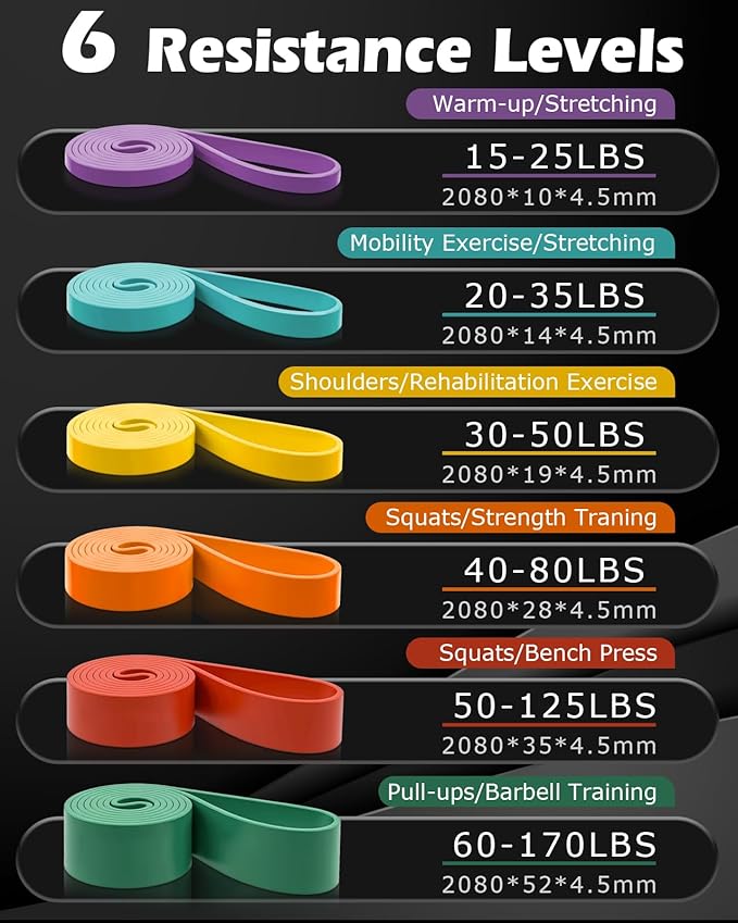 - 【Diverse Resistance Levels】: Explore our Pull Up Resistance Bands with 6 different color-coded bands, offering a distinct exercise bands resistance level: Purple (15-25 lbs), Cyan (20-35 lbs), Yellow (30-50 lbs), Orange (40-80 lbs), Red (50-125 lbs), and Green (60-170 lbs). Customize your workout by using a single band or combining multiple for increased challenge. Designed for individuals weighing 90 lbs to 300+ lbs