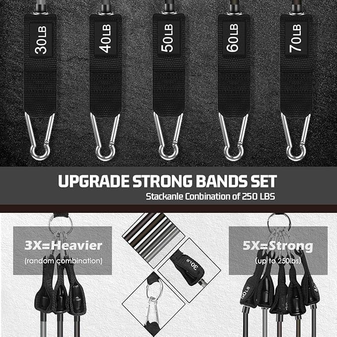 - Adjustable Resistance Bands - These 48-inch exercise bands for working out come in 5 resistance levels(30lbs, 40lbs, 50lbs, 60lbs and 70lbs), each with a distinct color. You can use them individually or combine them for a maximum resistance of 250lbs