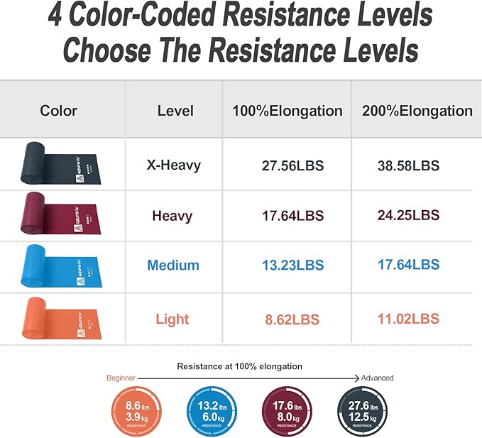 - 【Versatility and Flexibility】 Ideal for Resistance Training, Physical Therapy and Mobility Training, You Can Take a Couple Wraps Around Your Hands for More Tension and a Secure Grip. or Just Tie a Knot, For Use as a Loop Band, and also You Can Double Them Up for Even More Resistance. The Bands are Vibrantly Color-Coded, Once You are Ready for a More Challenging workout, You can Move Up to The Next Color.