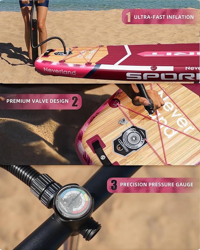 - 【Easy inflation & attractive design】SPORIT inflatable paddle board features convenient inflation and deflation capabilities. Equipped with a dual-action pump and high-end valve, it allows for effortless inflation and deflation. You can have it ready in just a few minutes, making it convenient and quick. Additionally, this paddle board has a stylish and unique design that adds charm and captures attention during your water adventures.