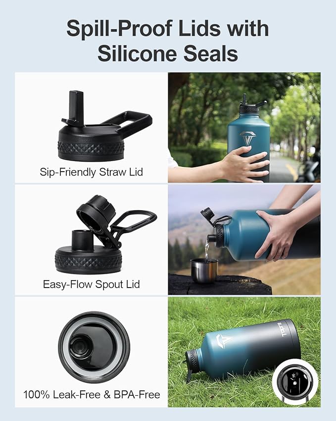 - No Leaks, No Worries: This stainless steel water bottle ncludes two leak-proof lidsβa straw lid and a spout lid. Both are equipped with silicone rings to prevent any spills or leaks, and are completely BPA-free for your peace of mind.