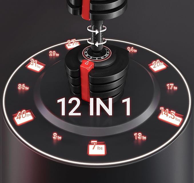 - 12-IN-1 ADJUSTABLE DUMBBELLS:This dumbbell set spans a wide weight range from 4 lb to 40 lb in diverse and smaller increments to facilitate gradual resistance, intensity, or volume adjustments.