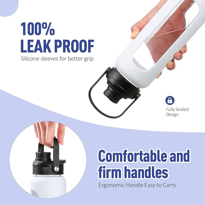 - DUAL LID WATER BOTTLE - Our glass water bottle is equipped with 2 lids, offering a range of options for drinking and transport. The bamboo straw lid makes sipping more effortless, allowing for easy hydration throughout the day whether you're at the home, office, gym, or outdoor activities. The leak-proof spout lid is designed for those who prefer a more traditional drinking habit. The spout enables smooth liquid flow and the handle attached to the lid allows for easy carrying on the go.