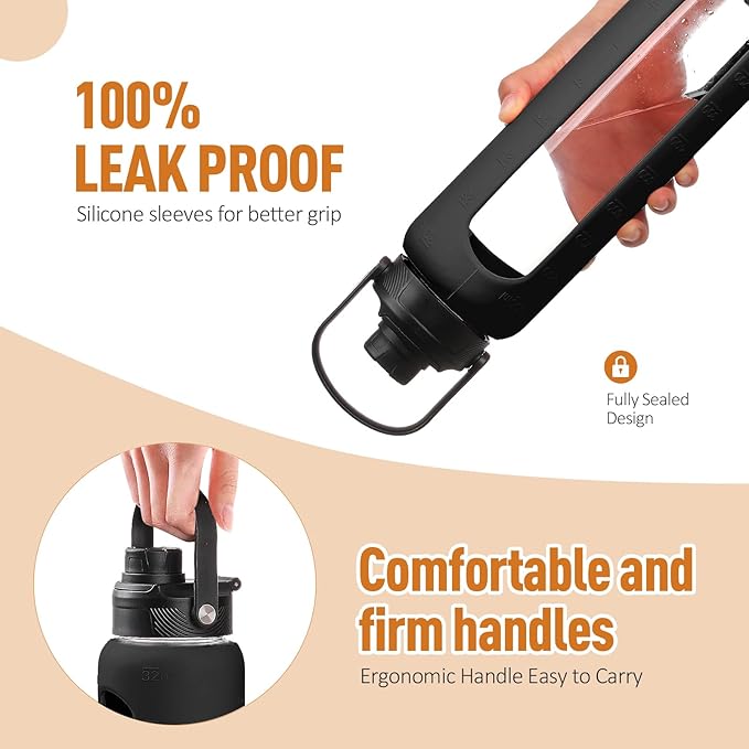 - 24 OZ AND 32 OZ VOLUME FOR OPTIONS - We have 2 sizes for those glass drinking bottles. The 32 oz glass water bottles are perfect for those who require a larger volume of water throughout the day. With this 32 oz bottle(1 liter water bottle), you can stay hydrated without the need for frequent refills. For those seeking a slightly smaller option, we offer the 24 oz glass water bottle, which is ideal for individuals who prefer a more compact and lightweight bottle.