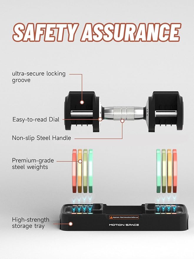 - š„ćSAFETY DESIGNćWith its innovative count weight plate design, it easily adjusts the weight by holding the handle and turning the pointer to the desired number. Our latest design includes 8 locking mechanisms, providing stability and ensuring safety during workouts.