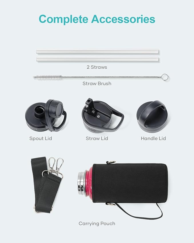 - Super Deal Combo: Buy 32oz insulated water bottle, get 7 accessories. The pack includes 1 x carrying pouch, 3 x lids, 2 x straws, and 1 x straw cleaner. This bottle is ideal for camping, hiking, cycling, running, gym sessions, or outdoor work, ensuring you stay hydrated wherever you go.