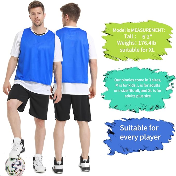 • 【3 size options】---scrimmage pinnies offer 3 sizes(M,L,XL) , whether it’s kids youth adults there are sizes that suit you. You can purchase a team jerseys that suits your needs,Medium for kids, Large for adults and youth, X-Large for big and tall adults.