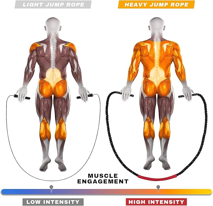 - đȘăFaster Achievement of Fitness GoalsăScientifically proven that 10 minutes of intense jumping with our weighted rope is equivalent to 30 minutes of running. This heavy duty rope is 10 times more efficient at working your core muscles than a standard jump rope, ensuring that you gain strength quickly with an effective weighted jump rope workout.
