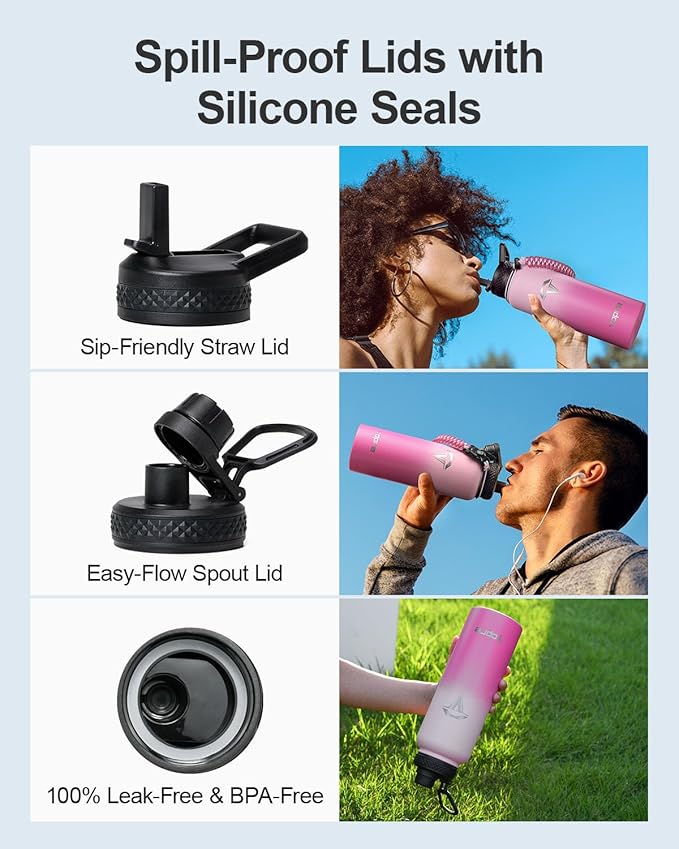 - 100% Leak-Proof: Topre 40 oz stainless steel water bottles includes two lidsβa straw lid and a spout lid. Both are equipped with silicone rings to prevent any spills or leaks, and are completely BPA-free for your peace of mind.