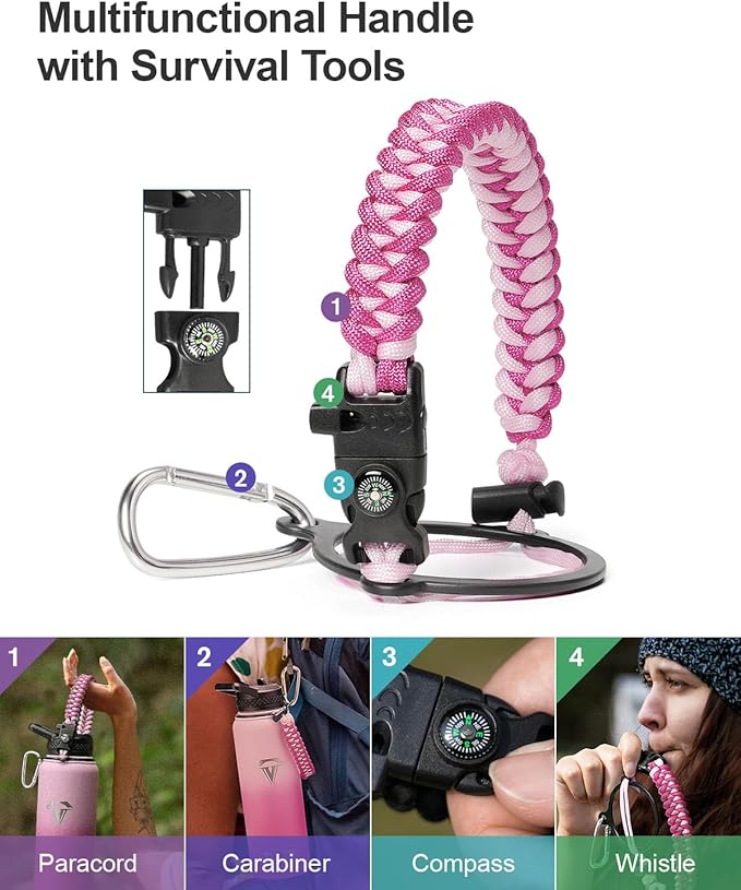 - Ready for adventures: Topre 40oz water bottles includes paracord handle is crafted from sturdy braided rope with an attached survival kit. This includes a compass, a whistle, and a clip, making it an ideal companion for any outdoor activity β be it camping,hiking or exploring new places through travelling.
