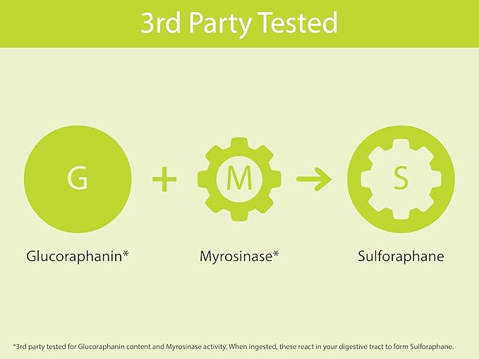 - GLUCORAPHANIN (Sulforaphane Glucosinolate) - 3rd Party tested for Glucoraphanin content. Myrosinase converts Glucoraphanin into Sulforaphane in the digestive tract.