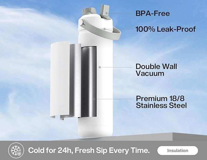 26 oz Insulated Water Bottle with 2-in-1 Straw and Spout Lid, Keep Cold 24H, Leak-Proof, Fits in Car Cup Holder, Stainless Steel Water Bottle for Sports, Travel, and School (Polar)
