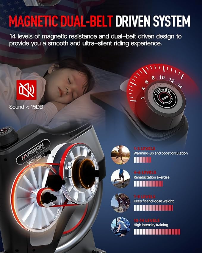 - HARISON Magnetic Dual Belt Driven System: HARISON HR-B50A recumbent exercise bike utilizes advanced magnetic resistance technology to provide you a whisper-quiet, joint-friendly workout that eliminates any potential disturbance to your surroundings. With a dual driven belt system to provide you a smooth workout experience. Suitable for different needs: Level 1-3 for warming up, 4-6 for rehabilitation, 7-9 for body building, 10-14 for muscle building.