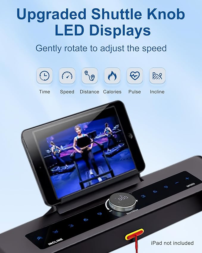 - Advanced Console with Bluetooth Integration: The LED knob display shows real-time workout data, while the touch console allows quick speed and incline adjustments. Connect the Bluetooth app to track progress and enjoy music through built-in speakers for an enhanced workout experience.