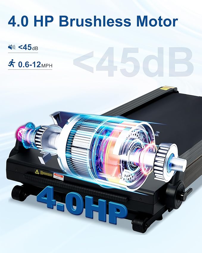 - 4.0HP Brushless Motor & 20% Auto Incline: The brushless motor ensures faster, quieter, and smoother operation, extending the treadmill's lifespan. It supports speeds from 0.6 to 12 mph and features a 20% auto incline (up to 5.2 degrees) for a more challenging workout.