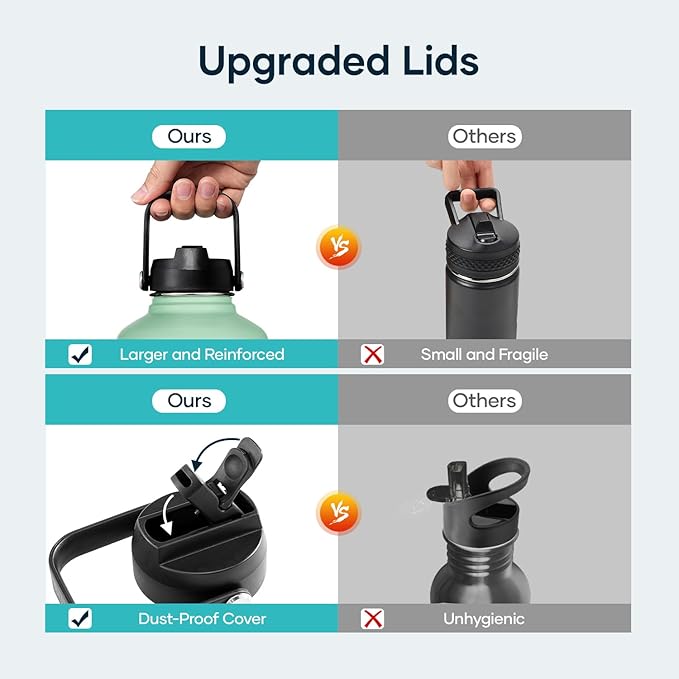 - 2 Caps Pack: This 64 oz stainless steel water bottle comes with straw lid and flex cap, the flex cap is perfect for the beach, camping and hiking, while the straw lid is suitable for cycling and road trip