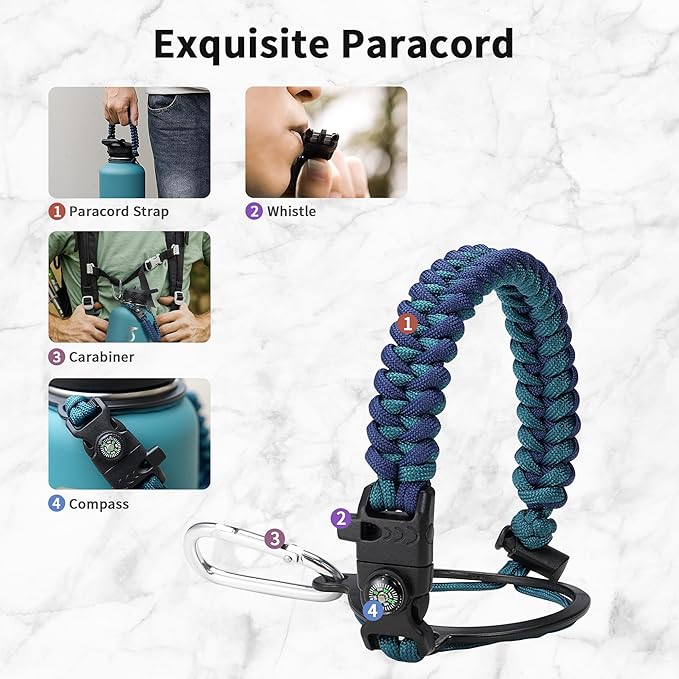 - Full-function Paracord Handle: Brilliant paracord of matching colors bring out the bottle with a touch of youthful vibe. Compact compass and handy carabiner make the bottle the ideal survival kit for expeditions in the wild