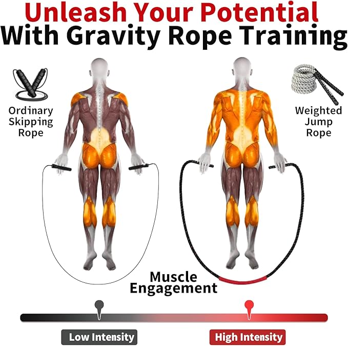 - Efficient exercise - It's scientifically proven that 10 minutes of intense jumping with a weighted jump rope is equivalent to 30 minutes of running. 10 times more effective at engaging your core muscles than a standard jump rope, this heavy-duty rope provides a new challenge but helps you build strength and endurance with every jump.