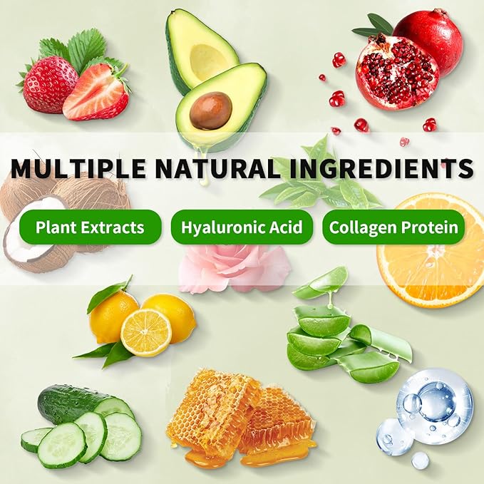 - 12 Pack Face Mask Gift Set - Our face masks come in 12 different types, Cucumber, Strawberry, Avocado, Rose, Lemon, Coconut, Aloe, Honey, Pomegranate, Vitamin C, Green tea, Hyaluronic acid. You can use a facial mask rich in natural ingredients every day, they will help you improve your skin condition, making skin smoother, firmer, more elastic and more moisturizing.