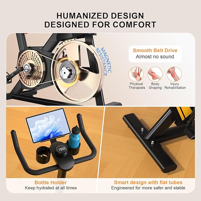 - Safe & Convenient to Use: Built for stability and safety even during intense workouts, the EYESUN exercise bikes for home supports up to 300 lbs. The resistance bar lets you stop the flywheel instantly for added safety, while the convenient adjustable knob allows you to customize resistance levels to suit your training goals. Thoughtful features like a monitor holder for your tablet or phone, a water bottle holder, and built-in transport wheels make your workout experience smooth and hassle-free.