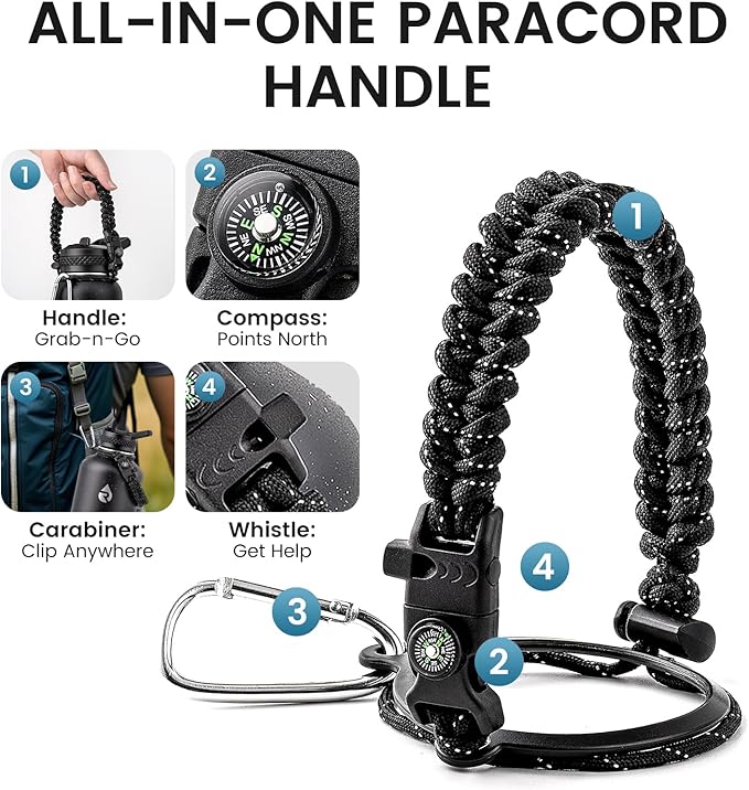 - Adventure Ready Paracord Handle: RAYMYLO 1/2 gallon water jug features a stylish color-coordinated paracord handle with a built-in compass and carabiner clip. This reusable water bottle's paracord handle is lightweight, durable, and perfect for hands-free carrying during hikes, cycling, or camping. Grab & go for spontaneous adventures under the stars!