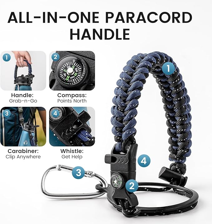 - Adventure Ready Paracord Handle: RAYMYLO 1/4 gallon water jug features a stylish color-coordinated paracord handle with a built-in compass and carabiner clip. This reusable water bottle's paracord handle is lightweight, durable, and perfect for hands-free carrying during hikes, cycling, or camping. Grab & go for spontaneous adventures under the stars!