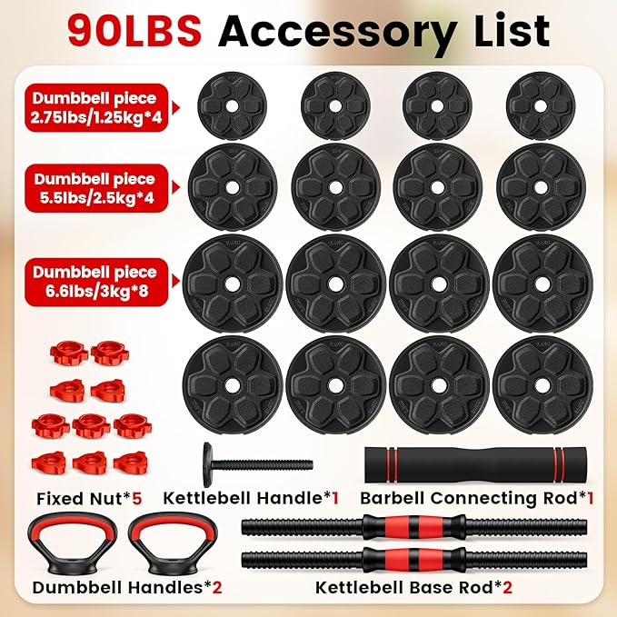 - 【Free Choice of Weight】The weight set's detachable design increases the flexibility of use. the single dumbbell is adjustable from 5-22 lbs, barbells: 8-47 lbs, and kettlebells: 5-23lbs. Effectively meeting your different exercise needs during various stages.Installation is simple.