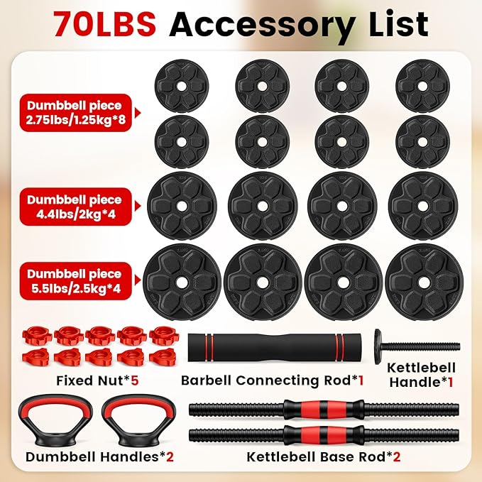 • 【Free Choice of Weight】The weight set's detachable design increases the flexibility of use. the single dumbbell is adjustable from 5-22 lbs, barbells: 8-47 lbs, and kettlebells: 5-23lbs. Effectively meeting your different exercise needs during various stages.Installation is simple.