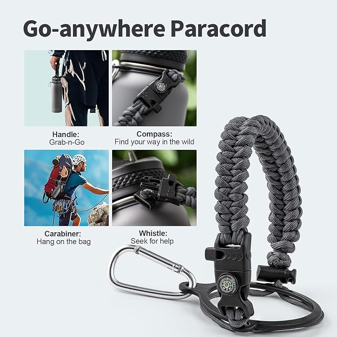 - Palm Fitting Paracord Handle: Compared to handle lids, nylon paracord on the bottle gives you more choices in terms of color coordination and coziness on your hands. Match the handle with your bottle to make a complete outdoorsy look. Compass and carabiner can be lifesavers for hiking and other expeditions