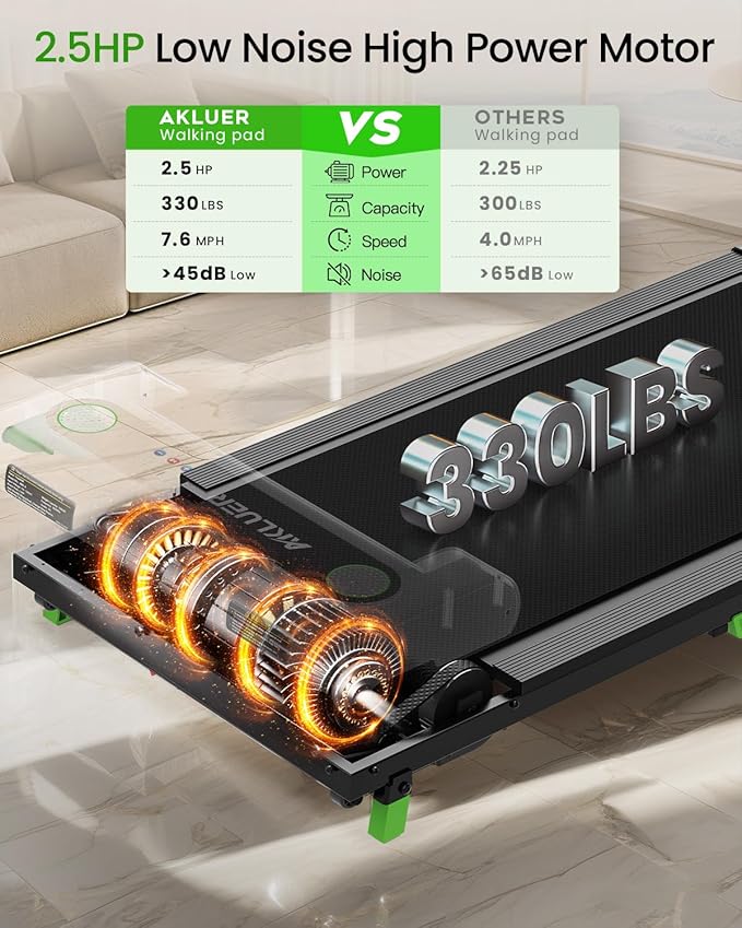 - 【Durable Quality for Long-Term Use】 The AKLUER desk treadmill equipped with an upgraded 2.5HP motor that delivers powerful and quiet performance, emitting less than 45dB of noise, providing a smooth and seamless running experience even at high speeds. With a speed range from 0.6 to 4 MPH, you can freely switch between walking and running to meet your different exercise needs, with a maximum weight capacity of 330lbs, ensuring your satisfaction during workouts