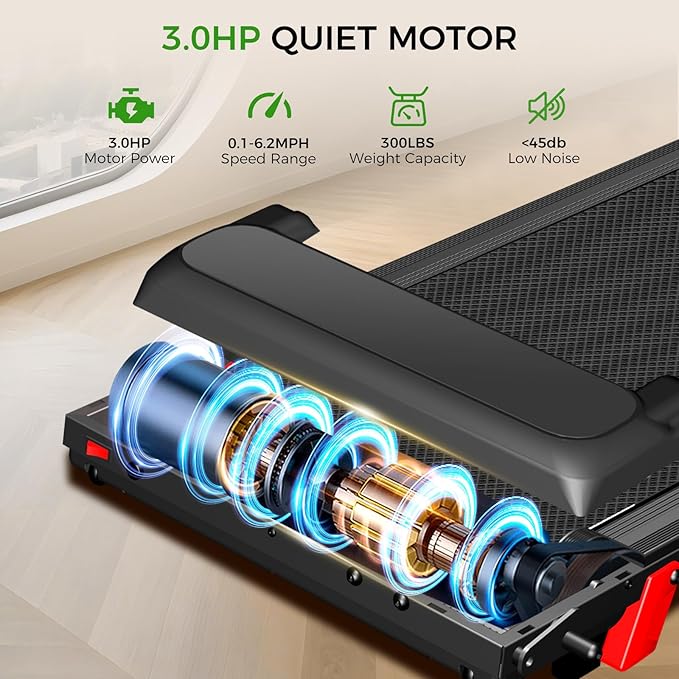 - Powerful Brushless Quiet Motor: This foldable walking pad treadmill features a powerful 3.0 horsepower motor that offers a weight capacity of up to 300 pounds. It has a speed range of 0.6-6.2MPH and quiet brushless motor produces less than 45 dB, makes sure your workout without create any noise. Designed for home/office use without disturbing your downstairs or next door.