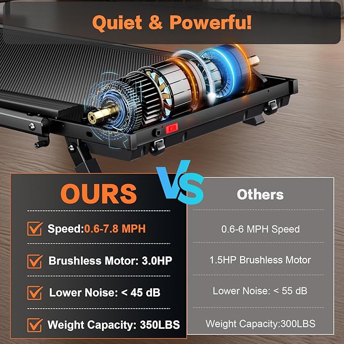 - 【Easy Storage & Space Saving】This inclined walking Pad treadmill front roller skate design allows you to easily drag it to change your storage location. This compact treadmill weighs only 42 lbs, Simply remove the screws for easy folding,The folded height is only 4.7 inches,making it easy to store in small spaces such as apartments or dorm rooms.