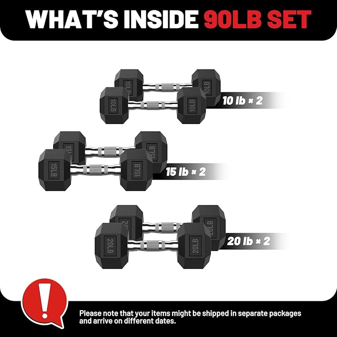 - 90 lb Dumbbells Set: Includes a pair of 10 pound, 15 pound, 20 pound rubber hex dumbbells, delivering lasting durability for strength training and exercise.