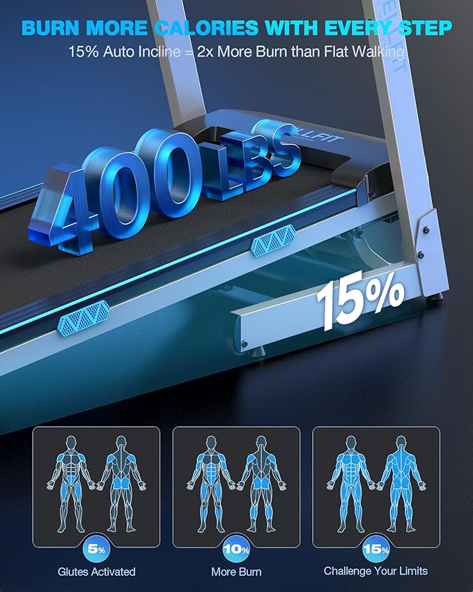 - 【0–15% Auto Incline – Burn More Calories at Home】Turn your walking treadmill into a full-body cardio machine with the touch of a button. The automatic incline adjusts from 0% to 15% smoothly and silently. Perfect for glute activation, muscle toning, and high-intensity hill training—without waking up the house.