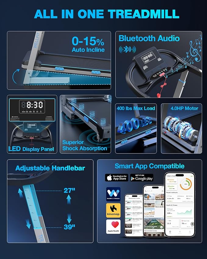 - 【Adjustable Handlebar for All Heights – 5'2" to 6'4"】 One Treadmill for the Whole Family! This WELLFIT treadmill with handle bar features an adjustable height from 27" to 39", perfectly suiting users from 5'2" to 6'4". Whether you're a teen, adult, or senior, maintain proper posture while walking or running—no hunching, no strain.