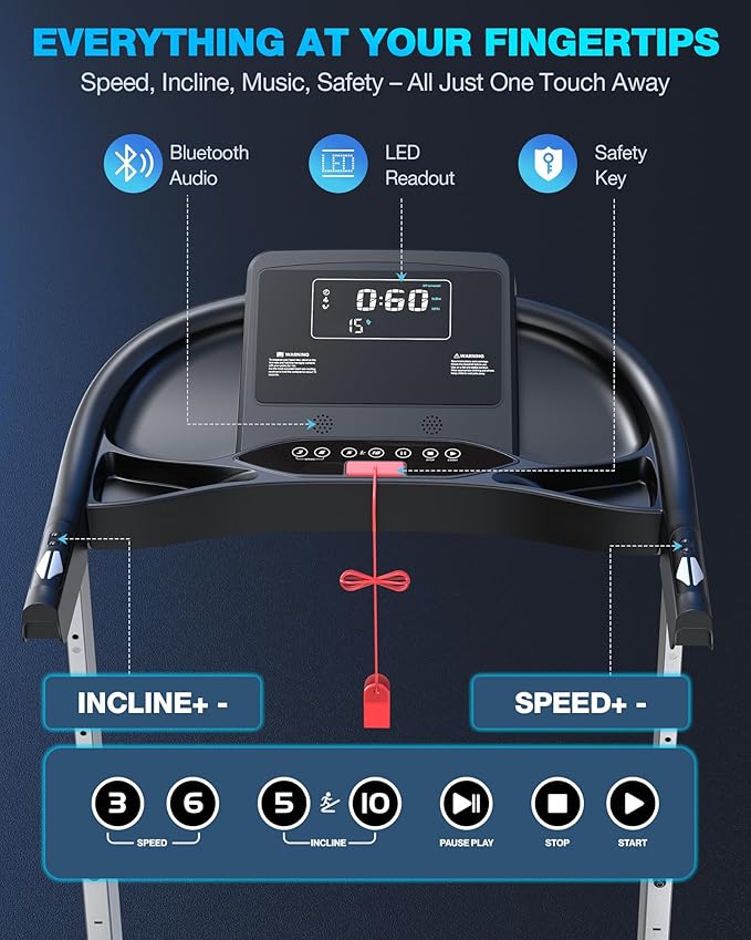 - 【LED Console + Safety Features for Peace of Mind】The large LED screen shows all your metrics: time, speed, distance, calories, heart rate (via handles), steps, and incline. Adjust your settings hands-free via the handlebar. Equipped with an emergency stop clip for safety during every workout.